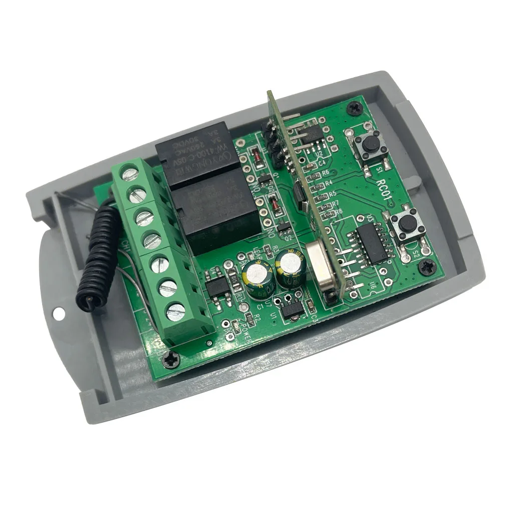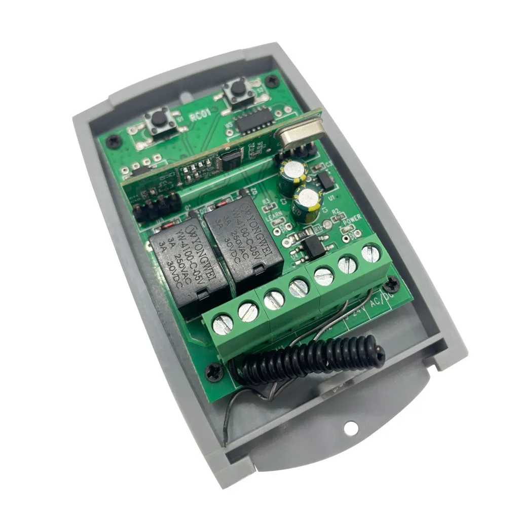 This product is a universal intelligent controller, which can be used with most wireless remote controls on the market. Including fixed code (2262, 2260, 2264, 5326, M1E, M5E, etc.), learning code (1527, 2240, 6P20B, 6P20D, etc.), scroll code (HCS301, HCS300, HCS200, HCS201, HCS100, HCS101, etc.) and some custom remote control