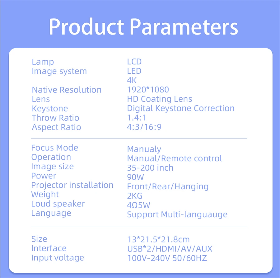 • Usage method Just connect the power supply, wait for the machine, adjust the focusing distance, screen size, and connect the WiFi signal, and then you can experience the home theater.