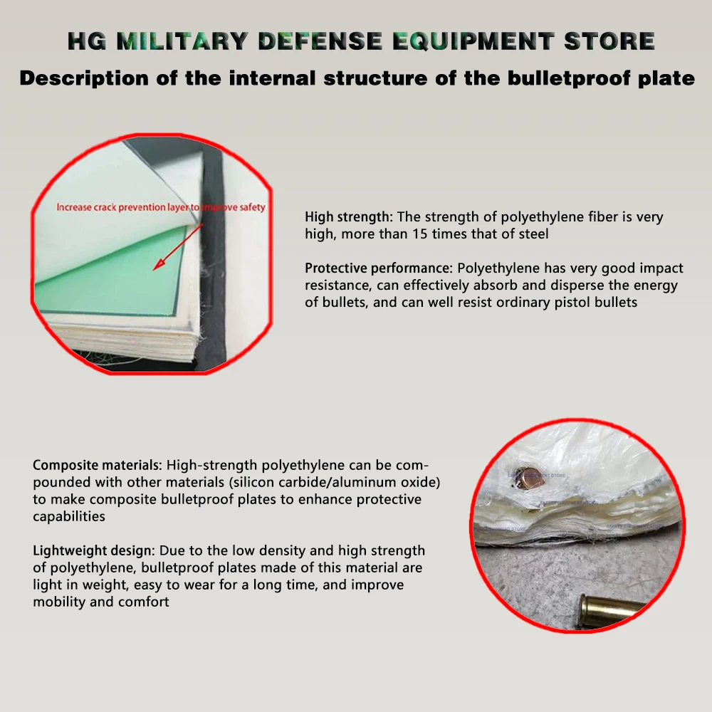 High-density polyethylene has excellent tensile strength and toughness, and can effectively resist bullet penetration. At the same time, when the material is impacted, it can effectively absorb and disperse the impact energy, reducing the harm to the user.